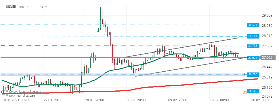 Silver is trading under pressure, however sellers failed to uphold momentum and price bounced off the lower limit of the ascending channel which coincides with major support at $27.00/ oz. However only breaking above the 50 SMA (green line) will invalidate bearish scenario. On the other hand, if daily candlestick closes below the aforementioned $27.00 support, downward move towards the next support area at $26.00 could be triggered. Source: xStation5