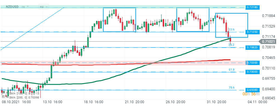 NZDUSD pair has been moving sideways recently, however during today's session buyers managed to break below the lower limit of the consolidation zone at 0.7135 which coincides with 23.6 Fibonacci retracement of the last upward wave. Later in the session the pair broke below the lower limit of the 1:1 structure and 50 SMA (green line) and is currently approaching major support at 0.7082 which is strengthened by 38.2% retracement. Source: xStation5