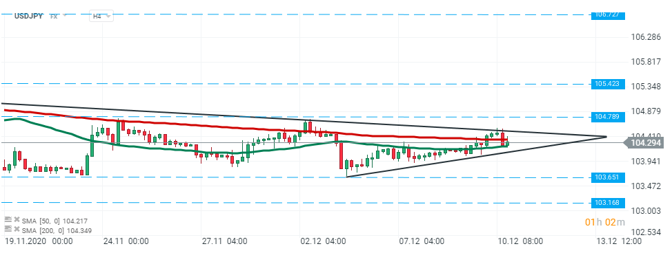 USDJPY – pair bounced of the lower limit of the tightening triangle formation which also coincides with the 50 SMA (green line) and 200 SMA (red line). Should the price break below the lower limit of the triangle formation, declines could deepen. In such a scenario, the 103.65 handle could be the first target for market bears. However, if buyers will manage to break higher, then upward impulse towards 104.78 could be launched. Source: xStation5