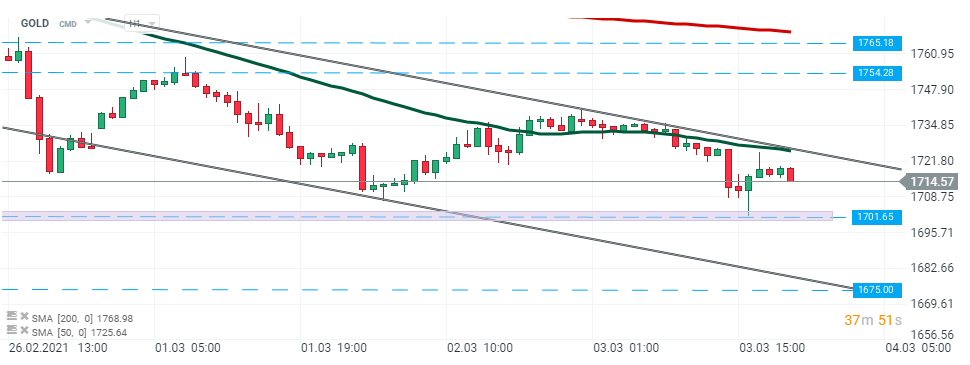 Gold fell sharply today, but sellers failed to break below the major support at $1700/oz and precious metal managed to partially erase early losses. However as long as gold is trading inside the descending channel, the trend remains downward and declines may deepen. Only breaking above the upper limit of the formation will invalidate the bearish scenario and upward impulse towards resistance at $1754 could be launched. Source: xStation5