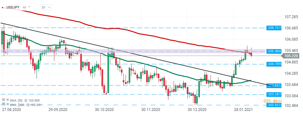 USDJPY – buyers failed to uphold recent momentum and pair fell below the 200 SMA (red line) during today's session. If the current sentiment prevails, support at 104.78 may come into play. Should a break below this level occur, downward move could be extended to the 103.65 handle. On the other hand, if bulls will manage to regain control, then nearest resistance lies at 106.72. Source: xStation5