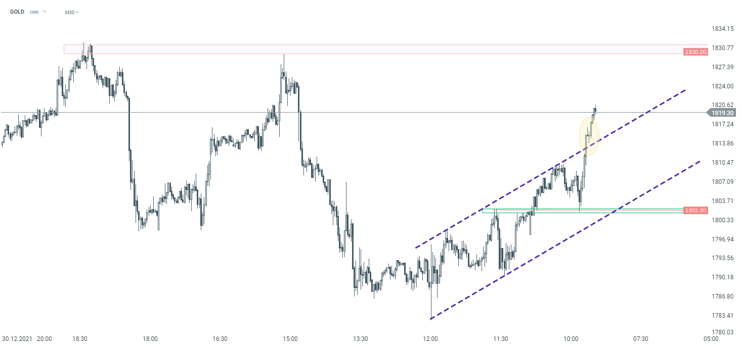 Gold strengthened today thanks to a weaker dollar. Looking at the M30 chart, the buyers used the $ 1,802 zone as a support and managed to break above the upper limit of the ascending channel, which could open the way towards the $ 1,830 resistance zone. Source: xStation5