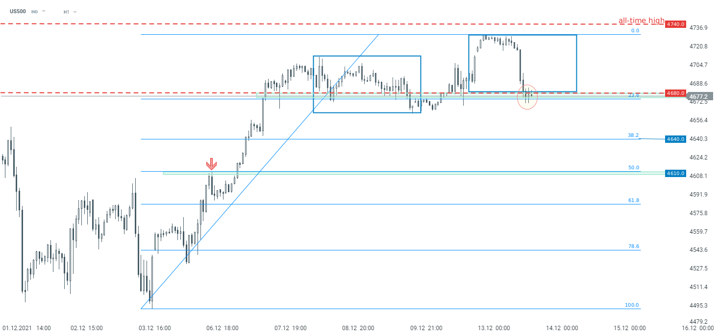 US500 reached the key support near 4,680 pts, H1 interval. Source: xStation5