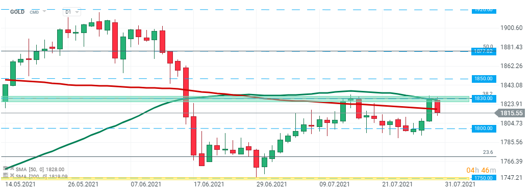 Gold prices rose sharply during yesterday's session however buyers failed to break above major resistance at $1830 and price pulled back. This level is marked with 50 SMA (green line) and 38.2 Fibonacci retracement of the downward wave from August 2020. If current sentiment prevails then support at $1800 may be at risk. Source: xStation5