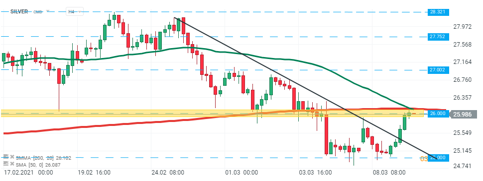 Silver – yesterday buyers managed to defend key support level at $25.00 and upward correction started. Early in the session price broke above the downward trendline and is currently testing major resistance at $26.00 which is additionally strengthened by 200 SMA (red line) and 50 SMA (green line). If buyers will manage to break higher, then next resistance at $27.00 could be at risk. On the other hand, if sellers manage to regain control, then another downward impulse towards the aforementioned $25.00 level could be launched. Source: xStation5