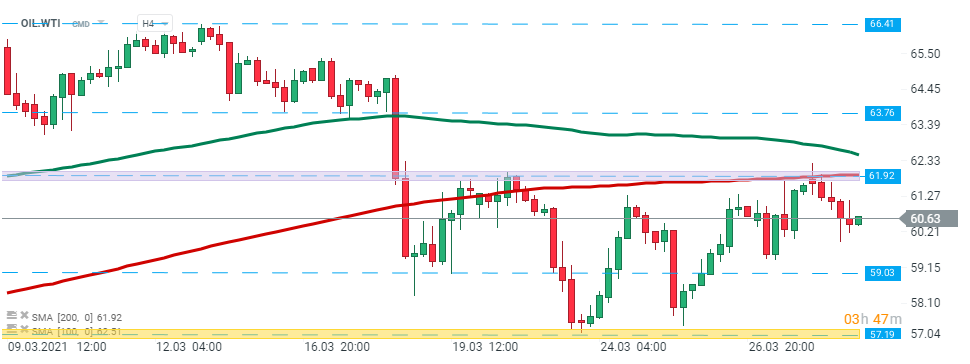 OIL.WTI has been trading in a local sideways move recently. Commodity failed to break above the resistance at $61.92 and price pulled back. Should declines continue, investors should focus on the $59.03 handle, where the previous price reactions can be found. However, in case we finally see a break above aforementioned $61.92, the upward move may accelerate towards $63.76. Source: xStation5