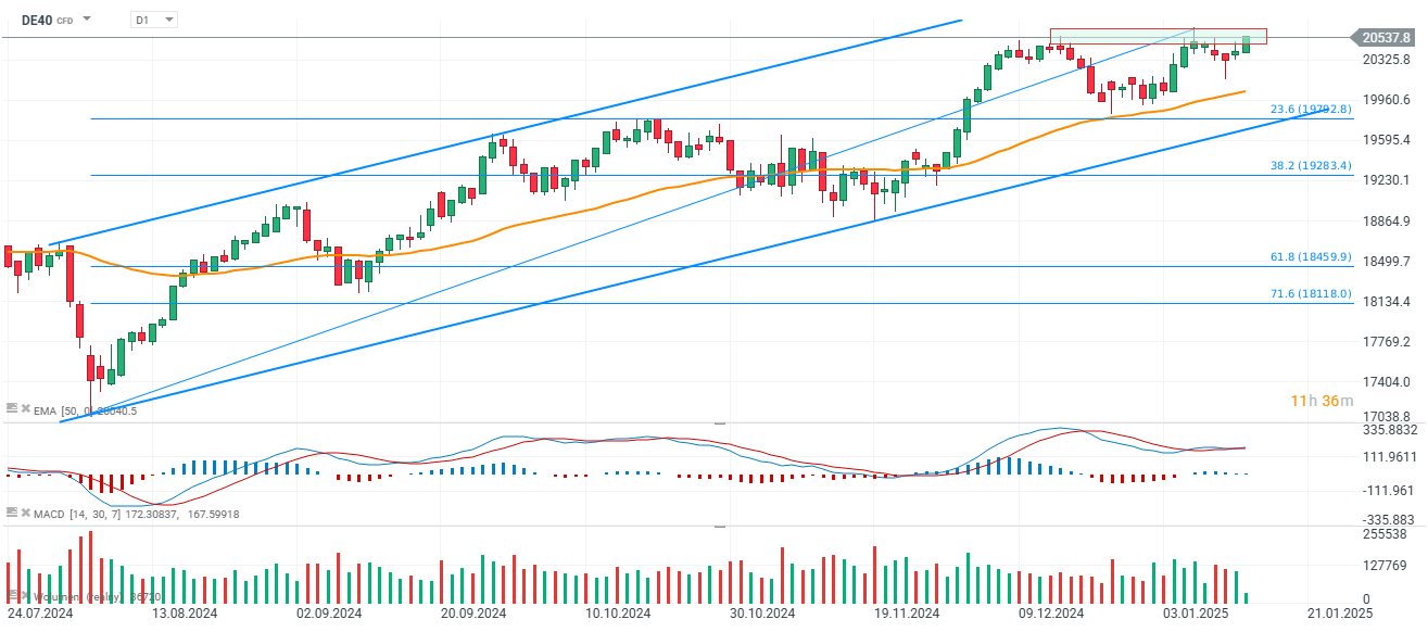 The DE40 continues its upward momentum, with the resistance zone at 20600 points now key. A strong candlestick formation on the daily interval makes a retest of historical maxima likely.