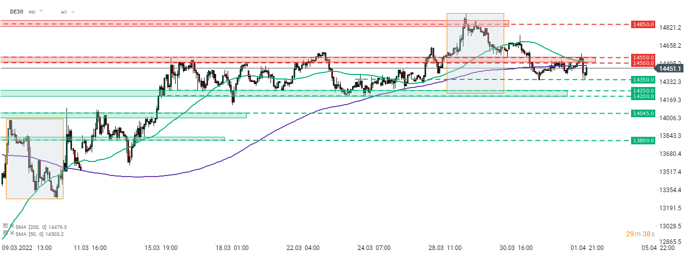 DE30 dropped at the beginning of today's cash session and retested local low from March 31 near 14,350 pts. Bulls managed to defend the area and a rebound can be observed now. The near-term resistance zone to watch can be found in the 14,500-14,550 pts area. This zone has seen numerous price reactions, the most recent one this morning. However, there are no major events or releases scheduled for today therefore a sideways move between 14,350 and 14,500 pts cannot be ruled out in the remainder of the day. Key short-term support can be found in the 14,200-14,250 pts area and is marked with the lower limit of local market geometry.