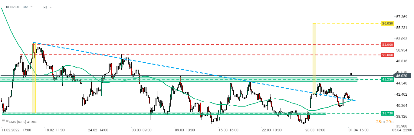 Delivery Hero (DHER) launched today's trading with a big bullish price gap following release of updated guidance. Stock is trading around 10% higher today and above €45.25 price zone. Shares broke above the triangle pattern last week and a textbook range of this breakout points to a possible upward move to as high as €56.05. Source: xStaion5