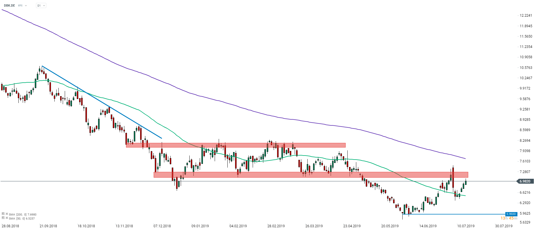 Deutsche Bank (DBK.DE) failed to break above the resistance zone ranging €7.10-€7.30 at the beginning of the month. The subsequent pullback was halted at the 50-session moving average (green line on the chart above). Now the stock is on the rise for another consecutive day and eyes another test of the aforementioned price zone. In case a break higher is delivered, bulls’ attention will shift to 200-session moving average (purple line). Source: xStation5