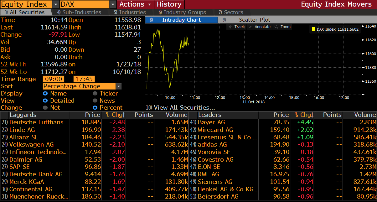 While most of the DAX stocks experience significant declines today there is one company that shines. Bayer (BAYN.DE) surges today after a shift in the Monsanto’s Roundup weed killer case. Roundup is the herbicide that was claimed to be the cause of cancer among numerous US citizen. Monsanto was ordered to pay $289 million fine during the first trial. However, one of the US Superior Court Judges said that the evidence is insufficient to reason the size of a fine. While some claims against Monsanto are likely to remain the total amount of a fine could shrink by as much as $250 million. Such an outcome could alter the outlook on Bayer that has greatly deteriorated after the case was brought up. Bayer acquired Monsanto earlier this year. Hearings in the case are scheduled on Wednesday.