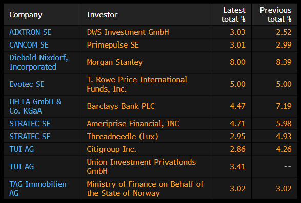 Changes in institutional holdings in individual companies of the DAX index (last session's data). Source: Bloomberg