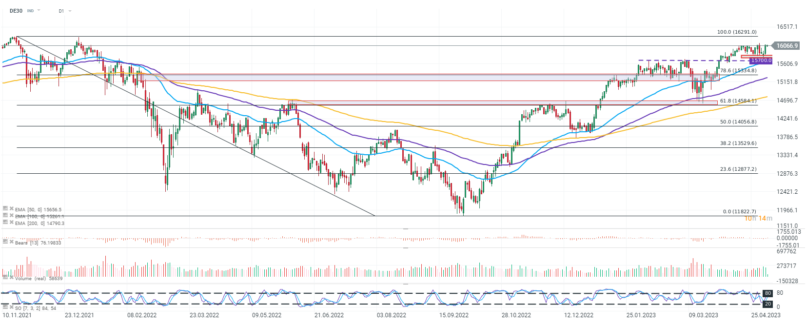 Futures based on the German DAX index (DE30) are trading higher today and are once again testing the region of resistance levels set by recent local peaks (zone just above 16,000 points). Source: xStation 5