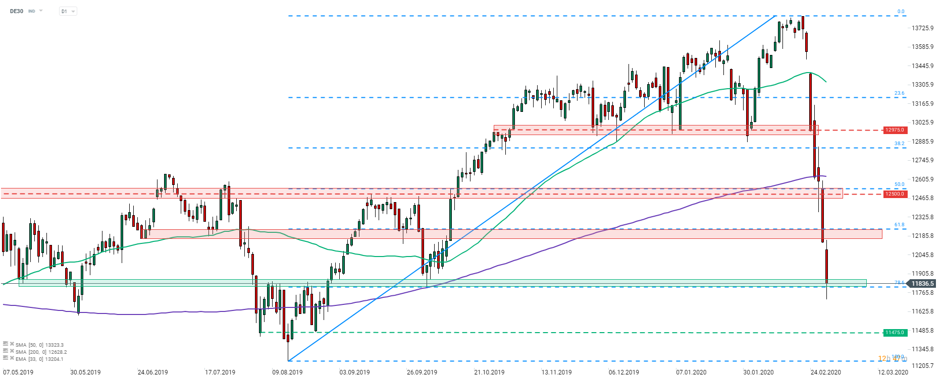 Rout on the global stock markets shows no signs of easing. European markets are taking another steep dive today with DAX trading over 4% lower and at the lowest level since end-Q3 2019. Peter Altmaier, German Economy Minister, held a press conference yesterday on potential actions aimed at limiting negative impact from the coronavirus outbreak. Among possible actions Altmaier named reducing tax burden for companies or boosting tax relief for digital investments. However, politician hinted that those measures should not be considered stimulus in the “classical sense”.