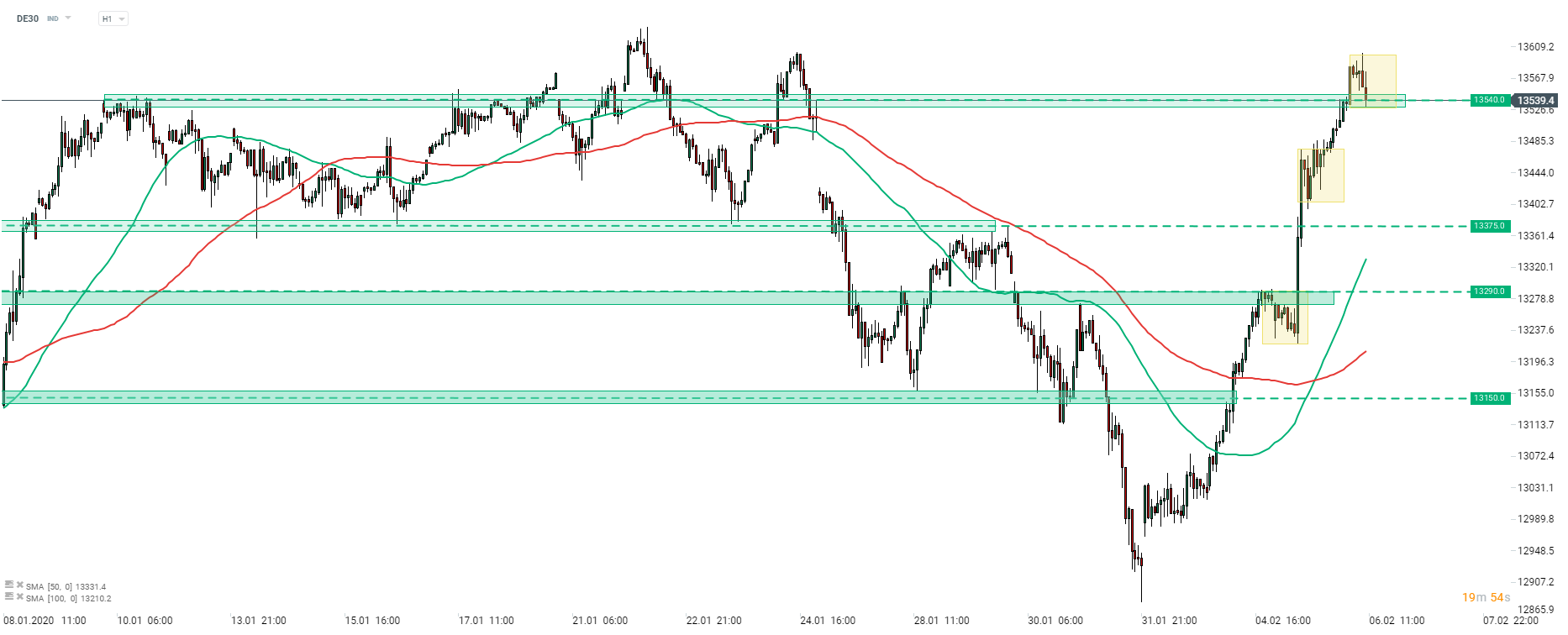 DE30 continues to rally today. The German index tested the 13600 pts handle in today’s early trading, but failed to hold onto the gains. Currently, we can observe the index pull-back towards the support zone at 13540 pts. A point to note is that in the same area one can find the lower limit of the local Overbalance structure. Having said that, a break below this hurdle could herald a deeper correction move. The first major support in such a scenario can be found at 13375 pts. Should the index rebound, another test of the 13600 pts mark looks likely. Should this level be clear, the way towards ATH will be left open.