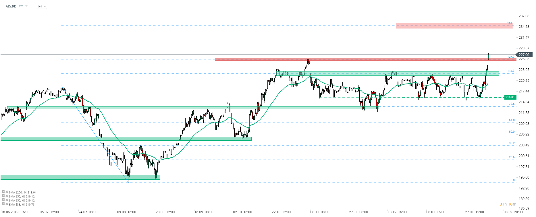 Allianz (ALV.DE) rallies along with the broad market. Following a break from the consolidation range, the stock surged above the resistance marked by 2019 high and 127.2% exterior retracement level of correction move started in mid-2019. The next hurdle in line can be found at the 161.8% exterior retracement (€234.50 area). Source: xStation5