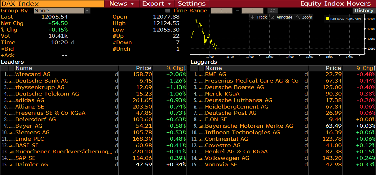 After the increase seen at the beginning of trading, the German DE30 has come back a bit but still trades in the positive territory. Source: Bloomberg