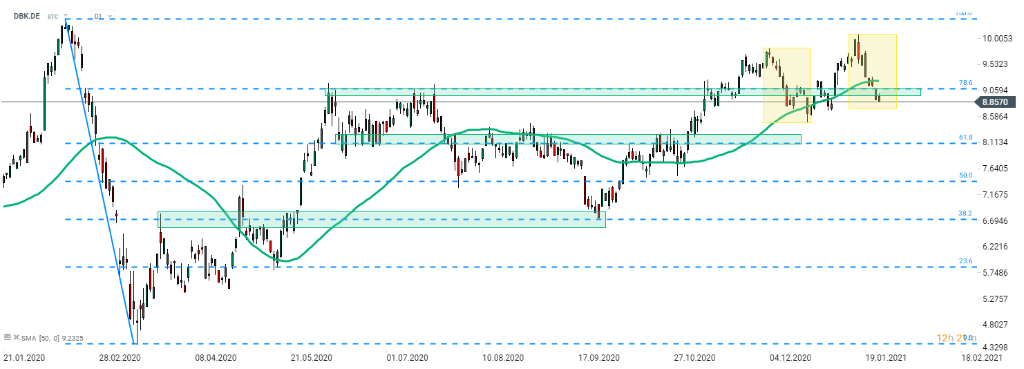 Share price of the Deutsche Bank (DBK.DE) dropped below the support zone marked with 78.6% retracement of early-2020 drop on Friday (€9.00 area). Stock remains below the zone today but trades a touch above Friday's close. Should downward move continue and the price drop below €8.75 (lower limit of the Overbalance structure), a deeper decline could follow. Source: xStation5