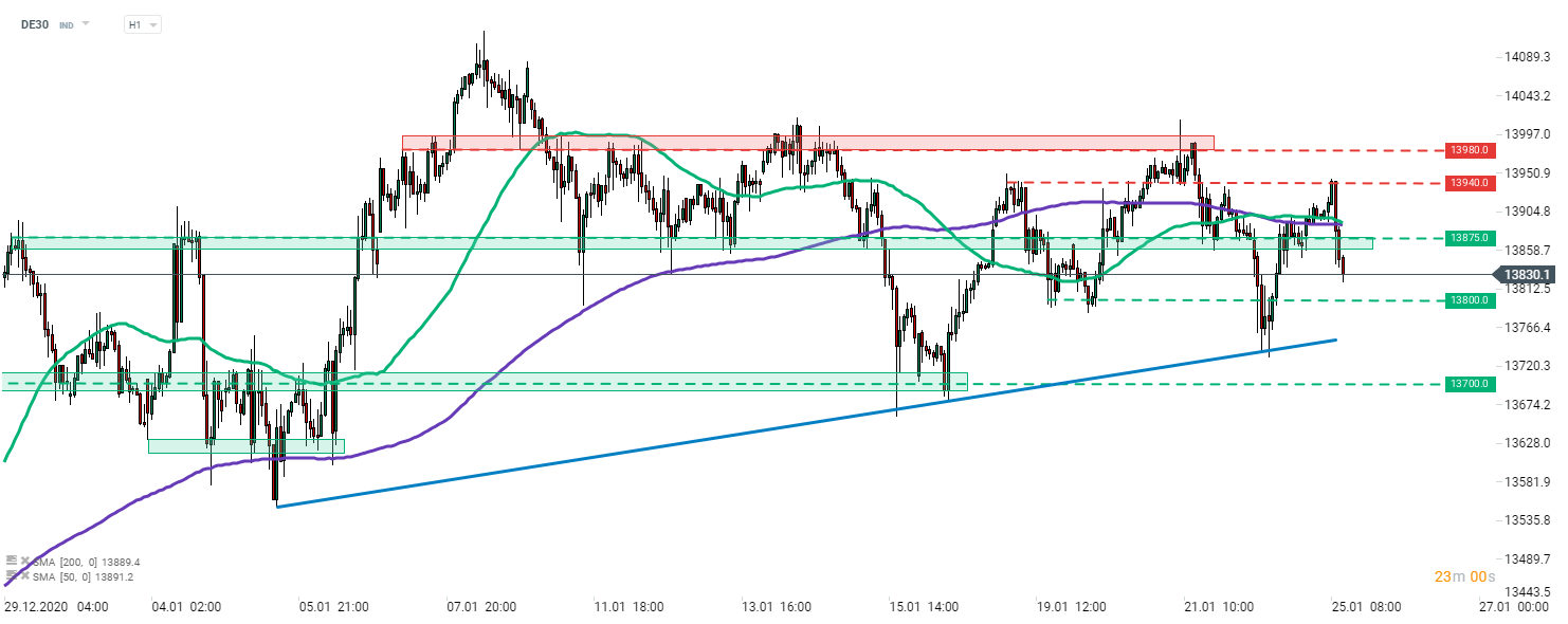 DE30 remains stuck within a wide 13,700-14,000 pts trading range and is unable to produce a bigger move in any direction. Following overnight gains, the index has managed to climb to the local peak from January 19 at 13,940 pts. However, a strong downward move occurred at the beginning of European cash trading and the index has given back most of the gains. DE30 broke below the support zone at 13,875 pts and the next level to watch can be found in the 13,800 pts area. A point to note is that if the downward move does not stop there and continue below the upward trendline, a short-term outlook may become bearish.