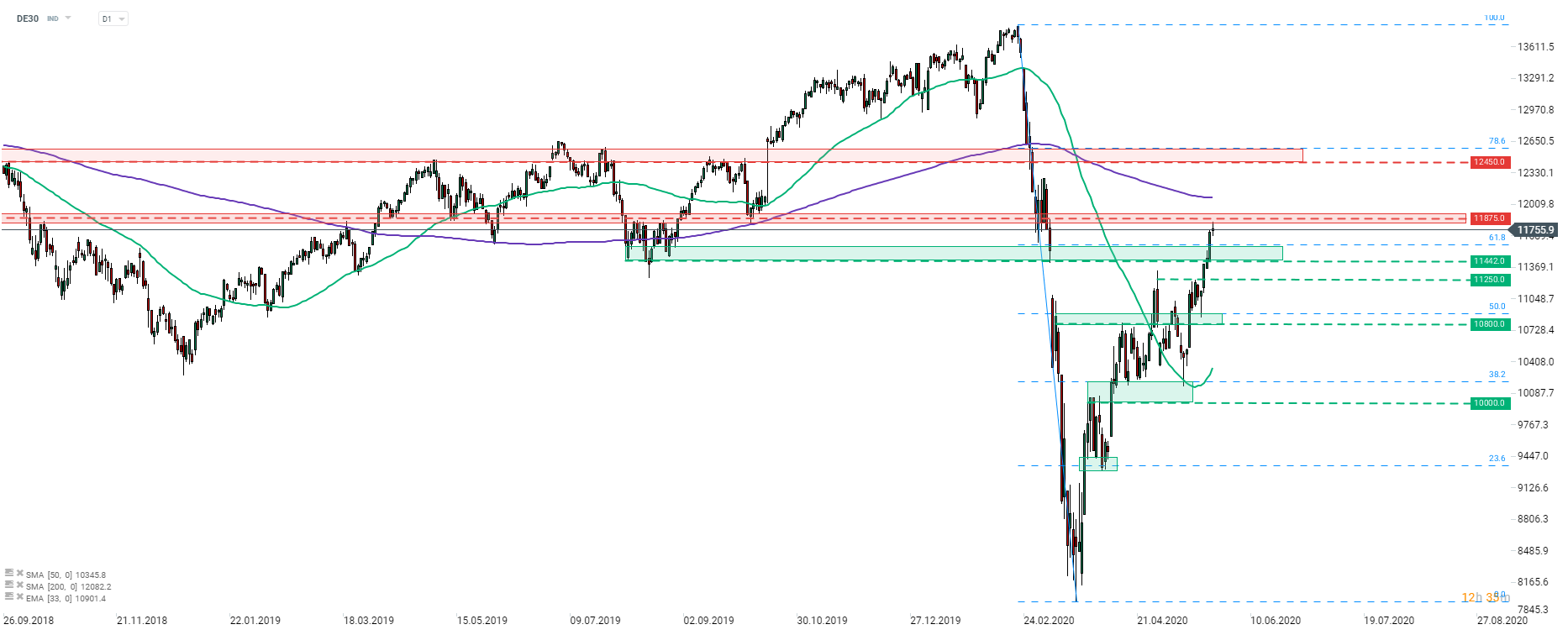 After clearing the 11,450-11,600 pts zone, DE30 has run into another important resistance. The index tested price zone ranging around 11,875 pts ahead of the European cash session open but gave up part of gains since. This is an important resistance marked with numerous tests over the previous 20 months. However, given strong upward momentum , this zone could also fall victim to bulls' binge buying. Some US hard data will be released in the early afternoon, including jobless claims and revised GDP report, but markets may not see much reaction to these. However, politics could play a role. Trump is expected to sign an executive order targeting social media companies today and it could have an impact on the sentiment. However, it seems that a major escalation in China-US tensions would be needed to trigger a more noticeable pullback on stock markets. The near-term support is the aforementioned 11,450-11,600 pts zone.