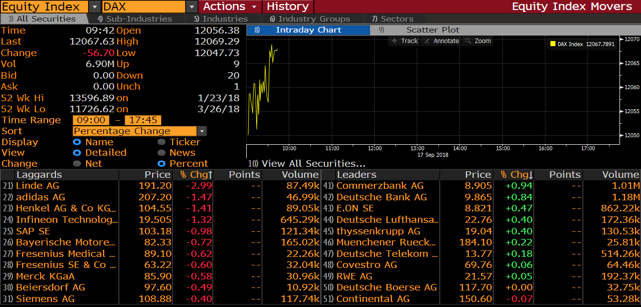 Linde (LIN.DE) leads DAX laggards as another hurdle related to Praxair merger could be on the way. Source: Bloomberg
