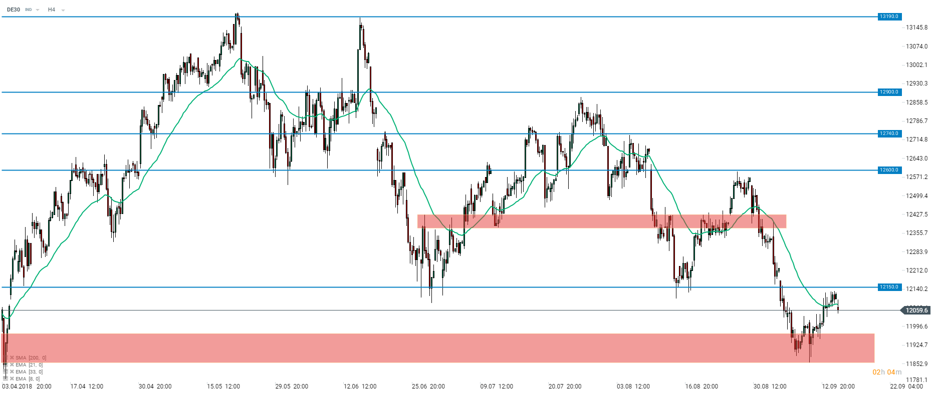 DE30 opened noticeably lower on Monday. The benchmark tested 12050 pts handle shortly after trading begun. The 33-period moving average can be found a notch above the market price at press time and may serve as a local, technical resistance level. In case this hurdle is breached during today’s trading the next area to watch could be the 12130-12150 pts zone. Source: xStation5