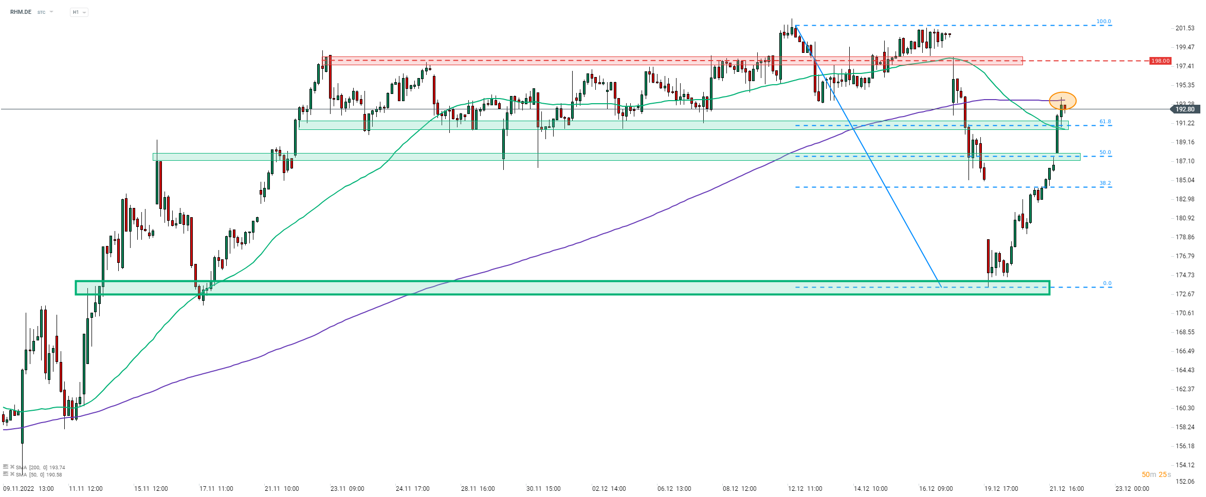 Rheinmetall shares (RHM.DE) have recovered most of the losses incurred since the German army halted purchases of Puma IFV. Company, and its partner KMW, announced today that they will resolve issues with Puma in 2-3 weeks. Stock tested the 200-hour moving average today (purple line) but has failed to break above. Source: xStation5