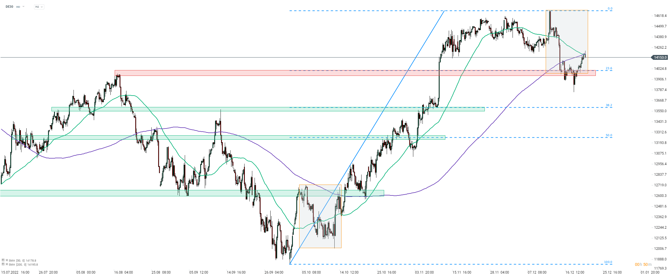 German DAX is trading flat on the day after erasing gains from the higher opening. A look at DAX futures (DE30) at the H4 interval shows that declines may be about to resume. While DE30 defended the lower limit of a local market geometry (orange box), it has failed to break above a mix of 50- and 200-period moving averages. A pull back from the area marked with the aforementioned moving averages can be observed at press time. Should bears remain in control, another test of the lower limit of the local geometry in the 14,000 pts area cannot be ruled out. Note that 14,000 pts area is also supported by 23.6% retracement of the upward impulse launched at the turn of September and October 2022.