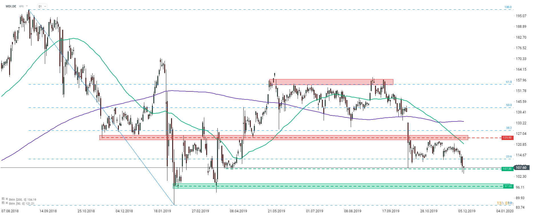 Share price of Wirecard (WDI.DE) is pressure by another Financial Times report today. The stock reached the lowest level since late-March 2019 at the beginning of today’s session but managed to recover slightly later on. Investors should focus on the €107 handle, a low from the beginning of April. Failure to close above it could see the price slide towards the support zone at €97. Source: xStation5