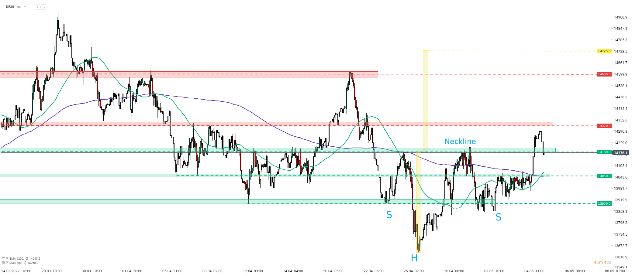Post-FOMC market euphoria allowed DE30 to break above the neckline of an inverse head and shoulders pattern. However, subsequent upward move was rather short-lived with advance stalling at 14,320 pts resistance zone. Index trimmed gains later on and pulled back to the neckline of the pattern in 14,180 pts area. Reaction to this level will be crucial. If it is only a post-breakout retest and bulls regain control, a move towards the textbook range of the inverse head and shoulders pattern at 14,725 pts remains possible. On the other hand, should we see a break back below 14,180 pts zone, a pullback towards the lower limit of recent range in the 13,900 pts area cannot be ruled out.