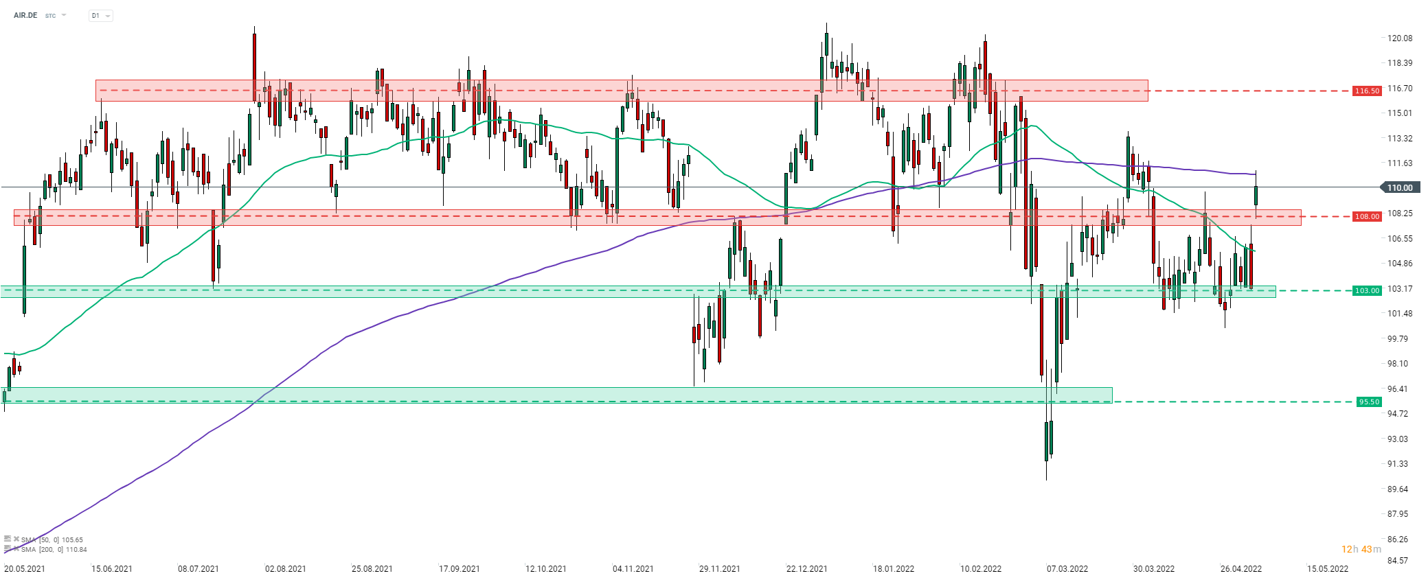 Airbus (AIR.DE) is the best performing DAX member today. Solid Q1 release pushed the stock 7% higher today. However, advance was halted at the 200-session moving average (purple line) in the €111 area. A break above would allow share price to test the upper limit of a mid-term trading range (€95.50-116.50). Source: xStation5