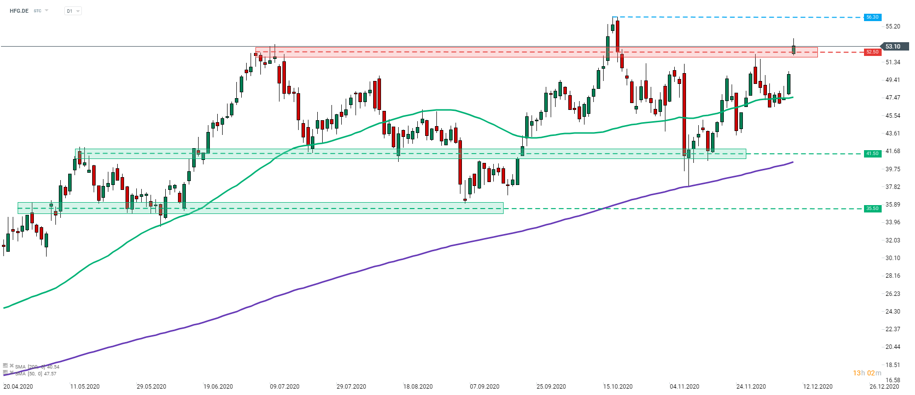 HelloFresh (HFG.DE) gains after releasing updated full-year outlook. The stock is trying to clear the €52.50 resistance zone that is the final hurdle blocking the way towards all-time high at around €56.30. Source: xStation5