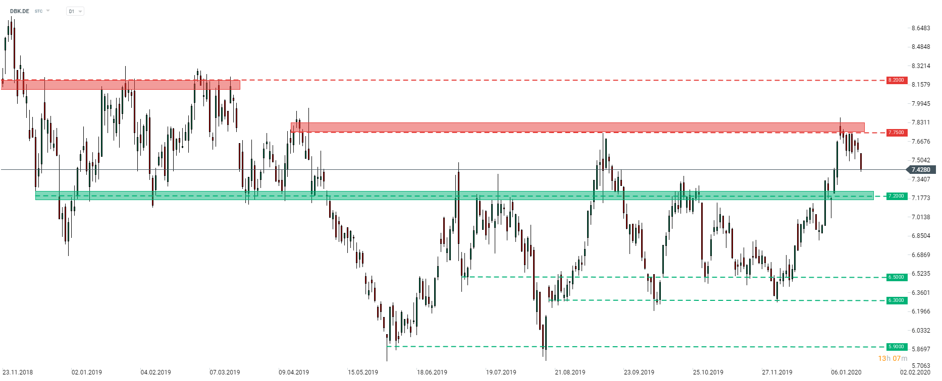 Deutsche Bank (DBK.DE) managed to jump around 25% between December 4 and January 9. However, the upward move was stopped by resistance zone at €7.50. This was the third attempt of breaking above this hurdle during the past 9 months and the third attempt that failed. The first potential support, in case the ongoing pullback deepens, can be found at €7.20. Source: xStation5