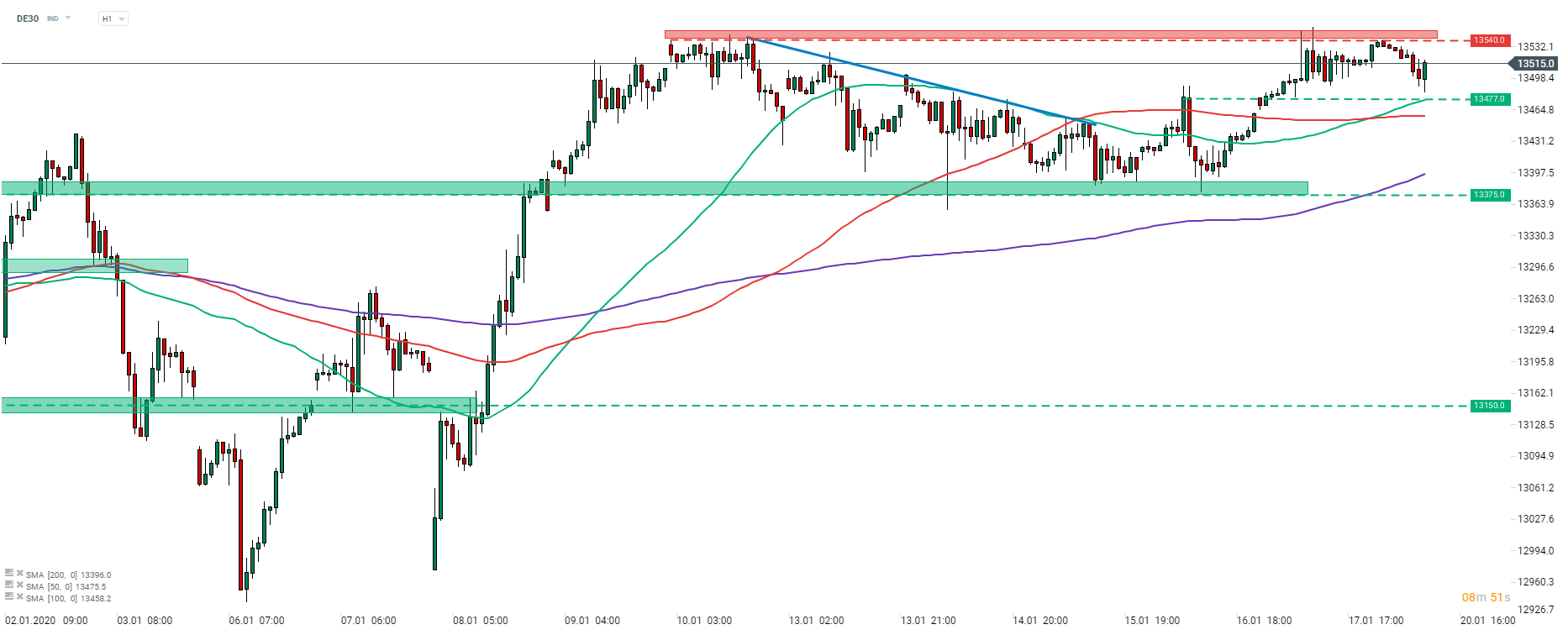 DE30 failed to break above the 13540 pts handle at the end of the previous week. This was another failed attempt of surpassing this resistance. A point to note is that the German index is behaviour is similar to the one that succeeded the first failed attempt. Having said that, the index may be set to launch a downward move towards the first major support - zone at 13375 pts. The 13477 pts handle could facilitate a near-term support as it is marked with the 50-hour moving average (green line) and intraday high from January 16. The aforementioned 13540 pts handle continues to serve as a topside resistance of the trading range and a break above it would push DE30 towards records.