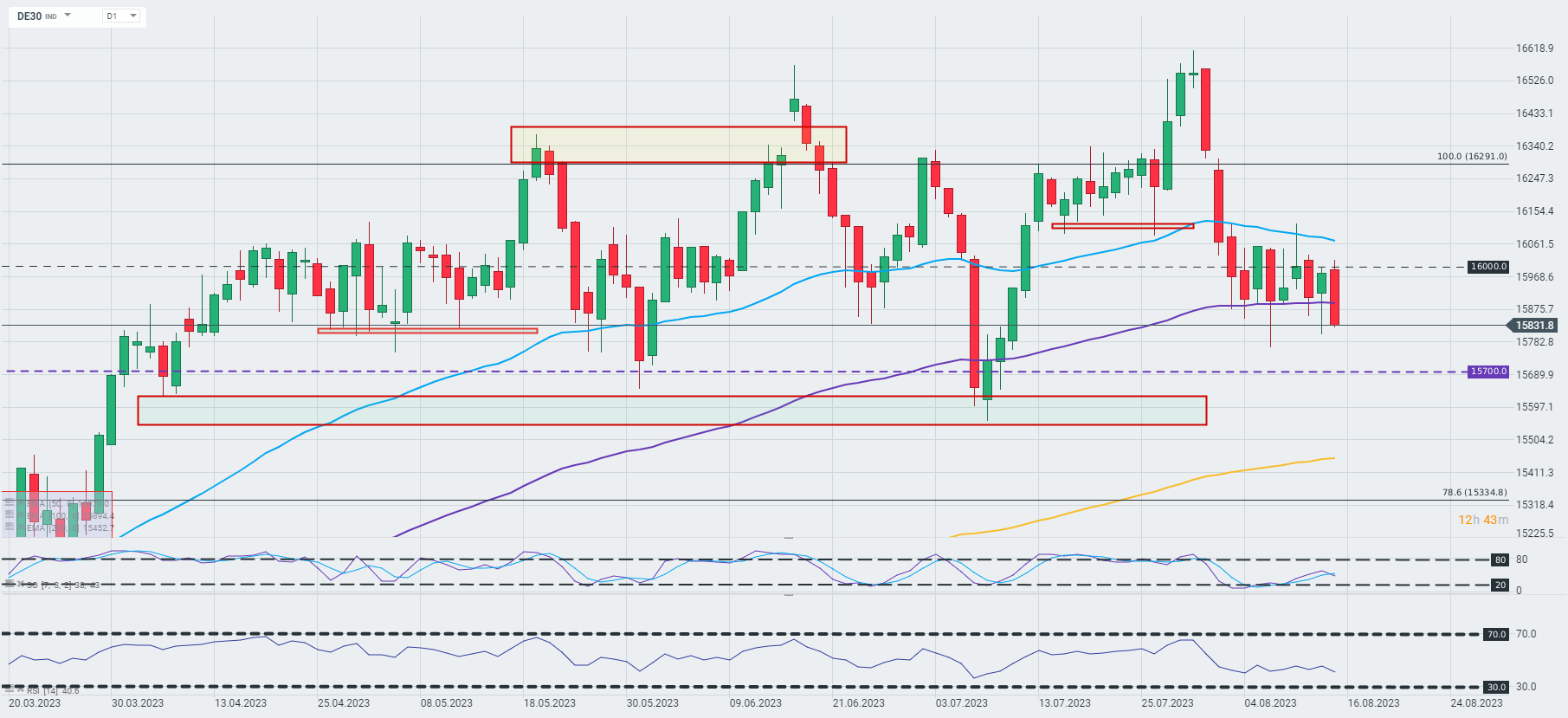 As the ZEW economists add, economic sentiment is improving, although the index remains in negative territory throughout. The end of the year, according to the economists, may bring more improvement in sentiment, but this will be mainly from the base effect of very weak sentiment now. Survey respondents no longer expect further interest rate rises by the FED and the ECB. DE30 is not reacting to the ZEW data reading.