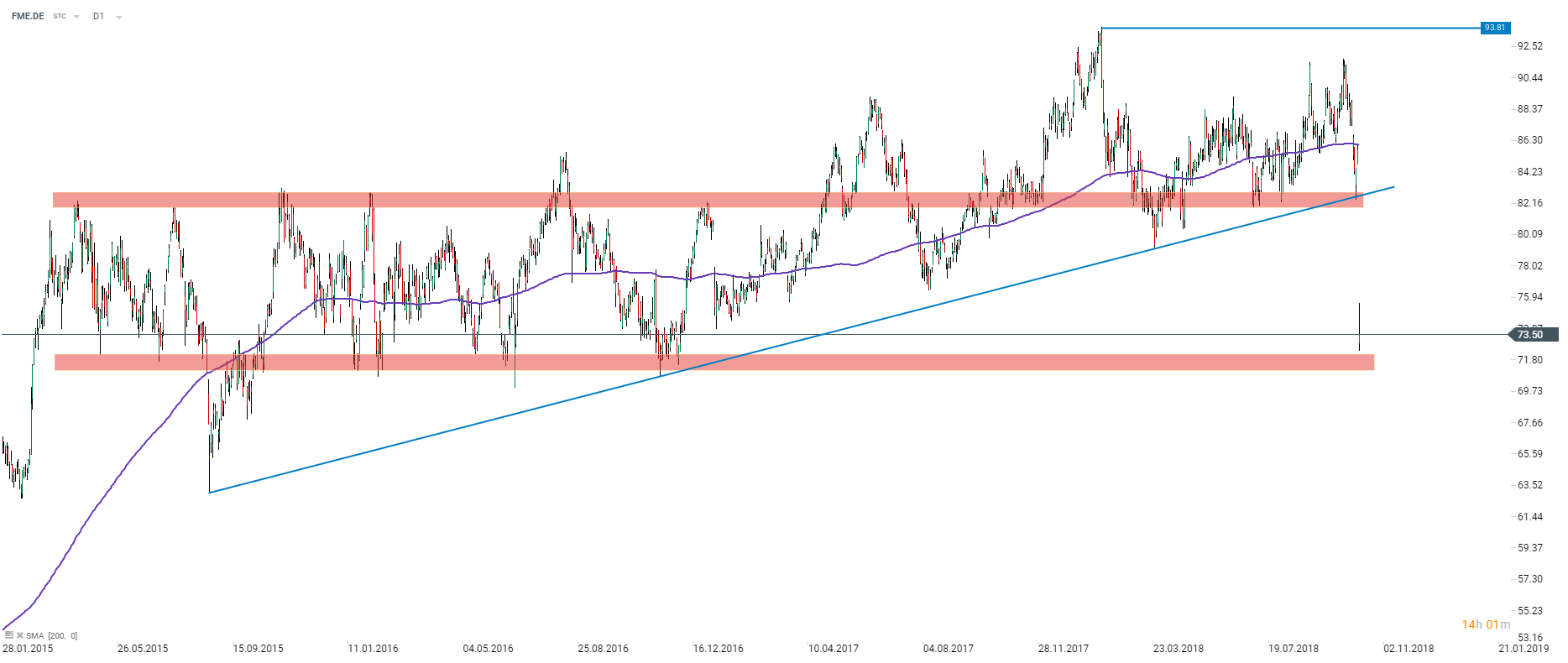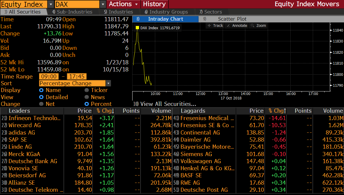 Fresenius Medical Care (FME.DE) is the worst performing DAX stock on Wednesday morning. As a reason behind such poor performance one can name an earnings report the company released recently. Fresenius Medical Care had net income of €310 million in the third quarter of 2018 against expected €345.75 million. Revenue turned out to be €4.058 billion while markets expected €4.225 billion. In turn the EPS of €1.007 was 9.7% lower than consensus estimate of €1.115. Moreover, the company issued a profit warnings for the whole fiscal year 2018. Apart from Fresenius Medical Care its parent company, Fresenius SE, also plunged after earnings release. Fresenius SE owns around 30% of Fresenius Medical Care.