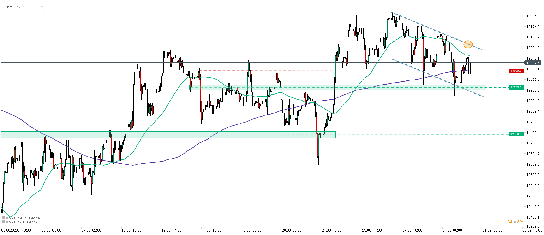 Rally on DE30 lost steam and the index began to decline. A clear downward channel can be spotted on the H1 and DE30 made a failed attempt of breaking above the upper limit at the start of today's cash session (orange circle). Downward move followed but the index found support near 13,000 pts handle - a level marked by previous price reactions as well as the 200-hour moving average (purple line). Should we see a resumption of downward move in the later part of the day, the index could be set to the test price zone at 12,935 pts, that can be found slightly above the upper limit of the aforementioned channel. On the other hand, should the index see a recovery in the afternoon, another test of the upper limit of the channel at around 13,090 pts could be on the cards. Release of the US ISM manufacturing index for August at 3:00 pm BST is a potential risk event for equities and overall sentiment.