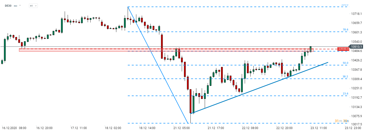 Panic triggered by the new coronavirus strain discovered in the United Kingdom did not last long. European markets also looked past Trump's refusal to sign the economic relief bill and continued recovery. DE30 broke above the resistance zone ranging between 61.8% retracement of a recent drop and 13,500 pts mark. Indices from the Western Europe trade over 0.5% higher today. Today is the final full trading of the week for German index as the stock exchange in Frankfurt will remain shut on December 24 and December 25.