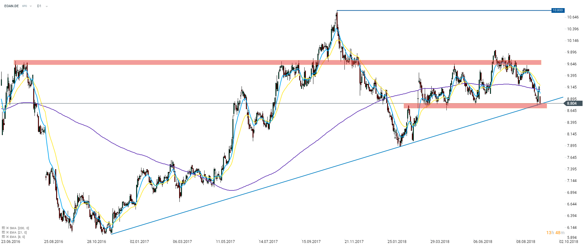 E.ON (EOAN.DE) shares underperformed recently and in turn price moved to the short term support zone that coincides with the upward trendline. The reaction to this technical hurdles may be crucial for the stock in the nearby future. In case we see a rebound an upward movement towards the long term resistance zone ranging €9.60-9.75 may be on cards. Source: xStation5