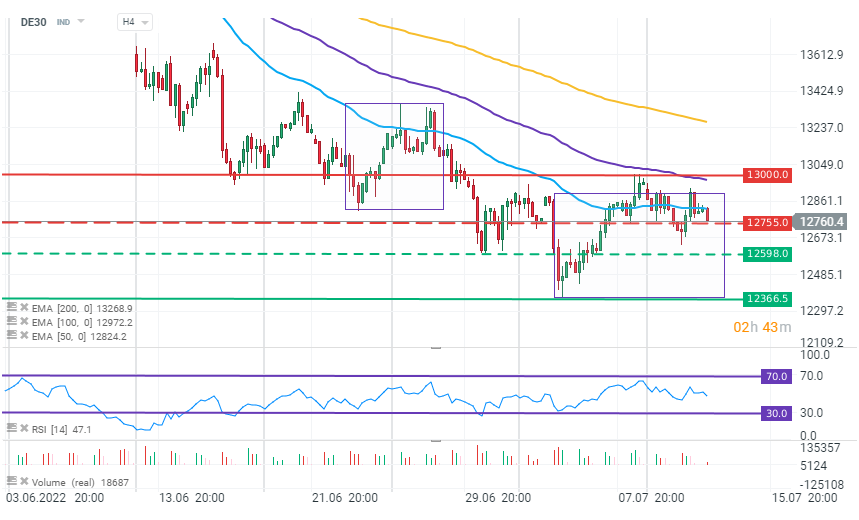 Chart of the DAX (DE30) index, H4 interval. The German benchmark is currently struggling to maintain the support set by the 12,755-point zone. The 50-period exponential moving average (blue curve) and the upper limit of the 1:1 structure can be regarded as local resistance levels. Source: xStation 5
