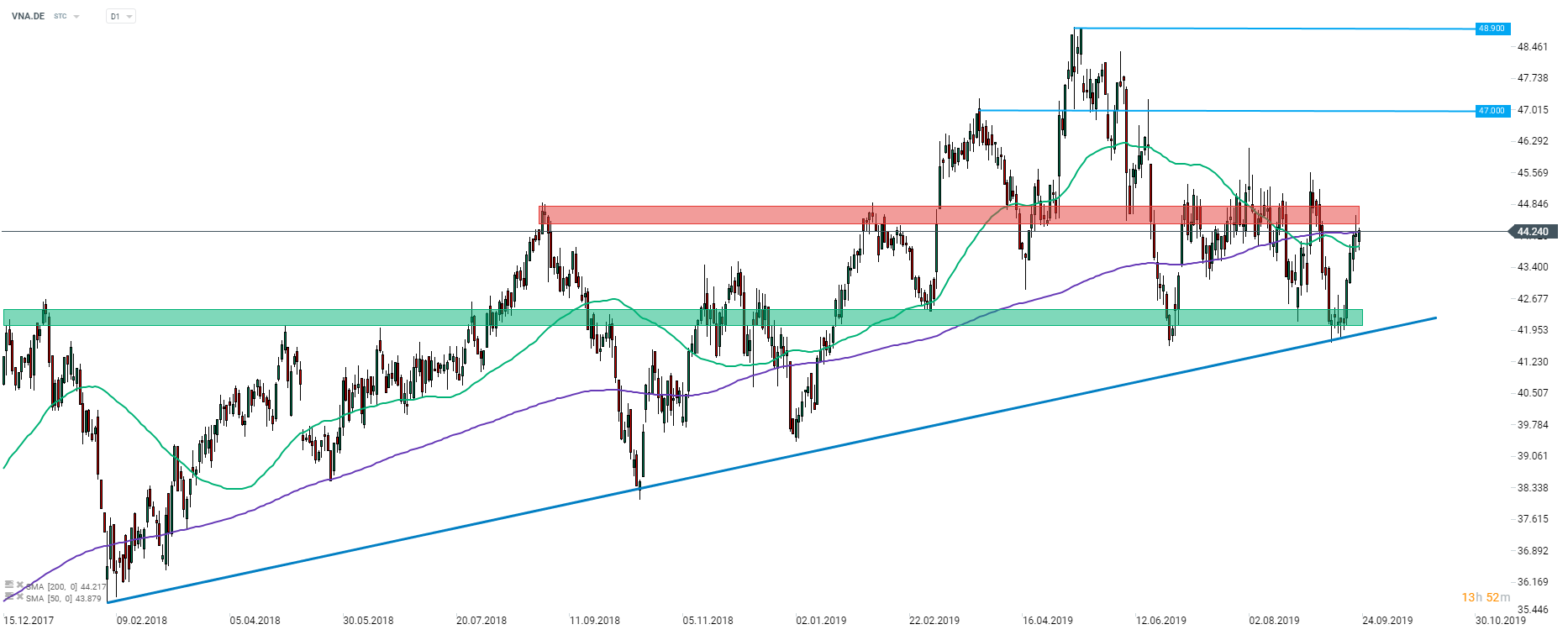 Vonovia (VNA.DE) rallied around 5% last week. However, continuation of the upward move may be under question as the stock reached two key obstacles - 200-session moving average (purple line) and the medium-term resistance zone (red rectangle). Source: xStation5
