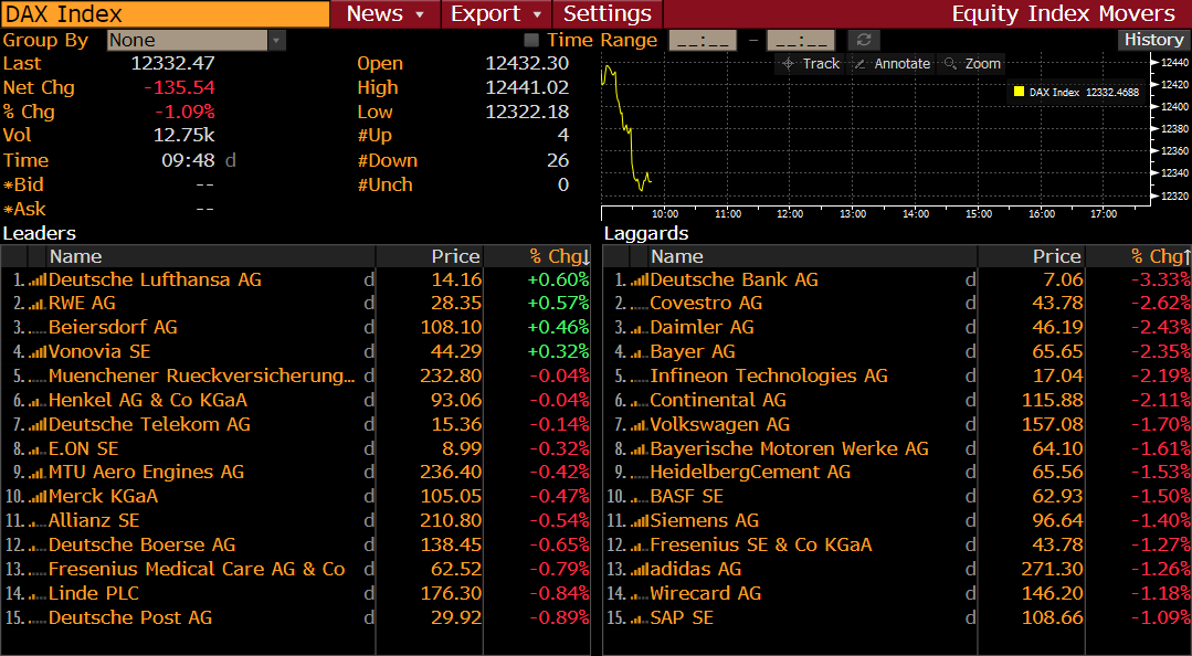 Lufthansa (LHA.DE) also received an upgrade at Bankhause Metzler. In this case the recommendation was raised by two notches, from “sell” to “buy”. The German carrier is the best performing DAX member after the first hour of trade.