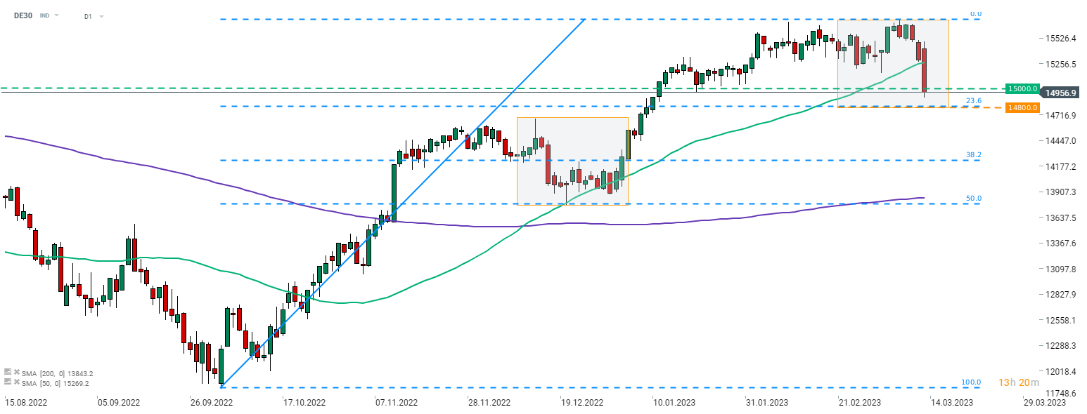 DE30 breaks below 15,000 pts for the first time since mid-January 2023 as concerns over the condition of US banks continue to pressure global markets. Key support to watch can be found in the 14,800 pts area - the lower limit of the Overbalance structure and 23.6% retracement of the upward impulse. Source: xStation5
