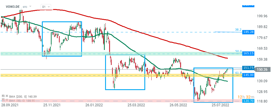 Volkswagen AG (VOW3.DE) stock bounced off recent lows at €120.70 and is currently testing the upper limit of the 1:1 structure around €151.75. Should break higher occur, upward move may accelerate towards resistance at €165.15, which coincides with 50% Fibonacci retracement of the upward wave started in March 2020. Source: xStation5