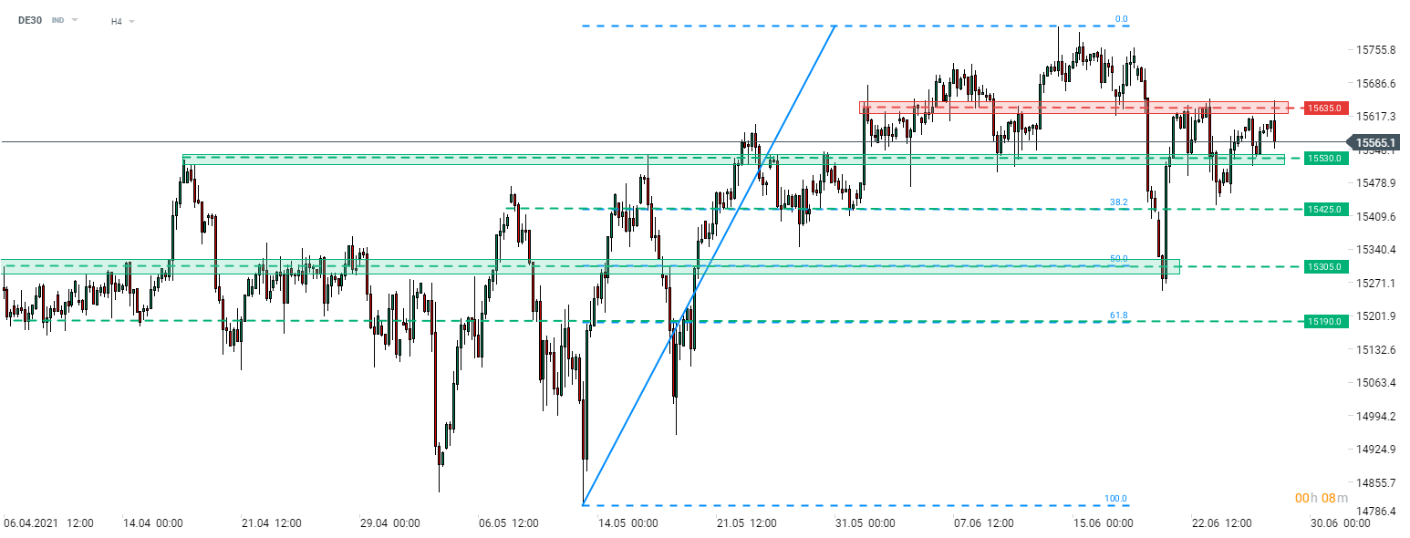 DE30 is struggling to fully recover from the post-FOMC market sell-off. German index attempted to break above the resistance zone at 15,635 pts last week but failed. Similar story played out this morning with DE30 jumping towards 15,635 pts and pulling back later on. Near-term support to watch can be found in the 15,330 pts area. Note that there is no crucial data scheduled for release today therefore the session ahead may be slightly muted. Fed and ECB members will deliver speeches in the afternoon but they have been cautious last week not to move markets too much. Having said that, DE30 may be set to range trade between 15,330 pts and 15,635 pts until the later part of the week.