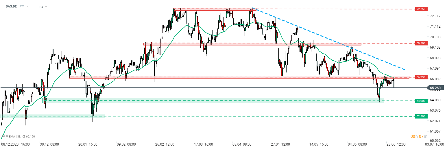 BASF (BAS.DE) is pulling back today following a failed attempt of breaking above the resistance zone ranging around €66.25. Note that the stock has painted a lower high in the current short-term downtrend structure. Near-term support to watch is marked with recent local low at around €64. Source: xStation5
