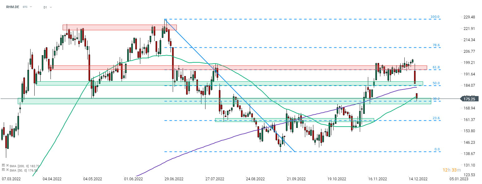 Rheinmetall (RHM.DE) is plunging for the second day in a row after German authorities halt purchases of Puma IFV. Stock dropped below 200-session moving average and 50% retracement of the downward move launched in late-June 2022. Share price is now testing support zone marked with 38.2% retracement (€175 area). Source: xStation5