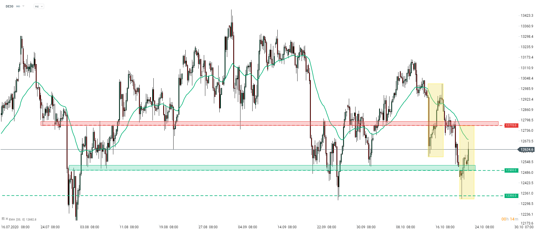 DE30 continues rebound from yesterday's low near 12,350 pts. German index caught a bid today in the morning after the PMI data release. Upward move has been halted near the 33EMA so far (green line, H4 interval). However, gains can extend towards 12,770 pts, where the upper limit of the Overbalance structure can be found (yellow box). Breaking above this hurdle could hint at a bigger upward move being underway. Source: xStation5