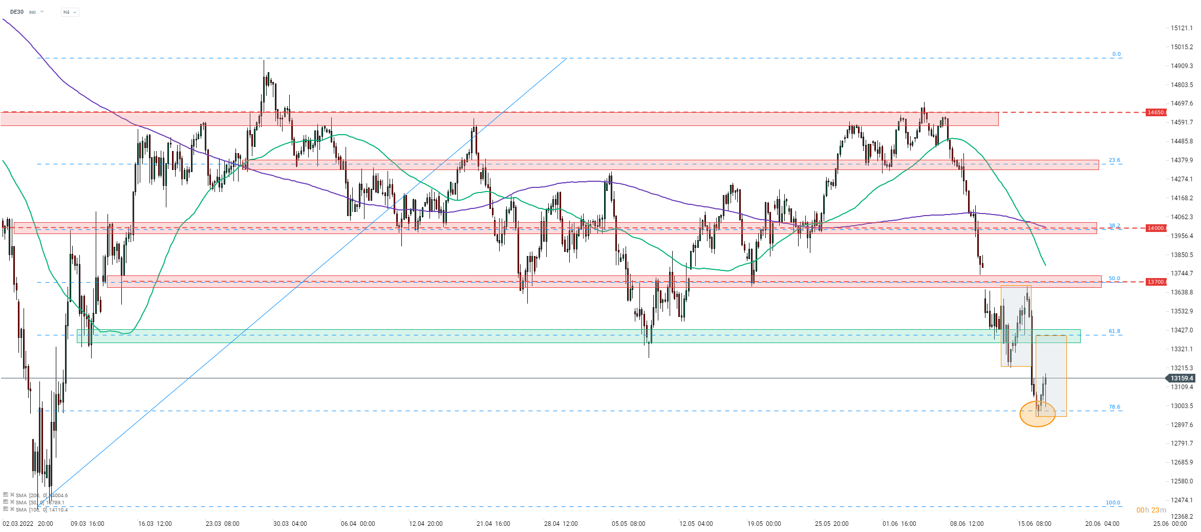 Yesterday's slump on DE30 market was halted in the 13,000 pts area, marked with 78.6% retracement of the upward move launched in early-March 2022 (orange circle). An attempt to launch a recovery move can be spotted today. A key resistance zone to watch it case it continues can be found in the 13,400 pts area, marked with previous price reactions, 61.8% retracement as well as the upper limit of a local market geometry. A break above this hurdle would be needed to brighten the outlook for bulls.