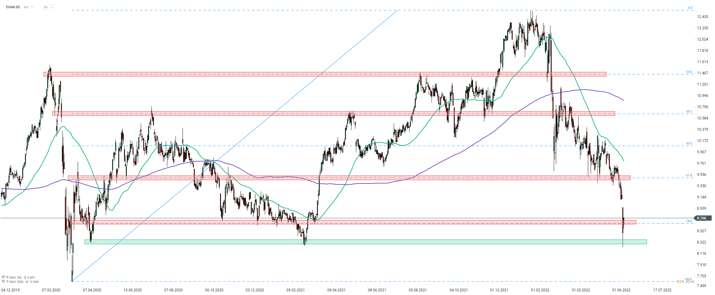 E.ON (EOAN.DE) is one of the best performing DAX stocks, following an upgrade it received at Goldman Sachs. Stock is trading 2% higher on the day and attempts to make a break back above the 78.6% retracement of the post-pandemic recovery move. Goldman Sachs says that there is potential for a tariff hike amid recent surge in natural gas prices, and it would have a positive impact on E.ON results. Source: xStation5